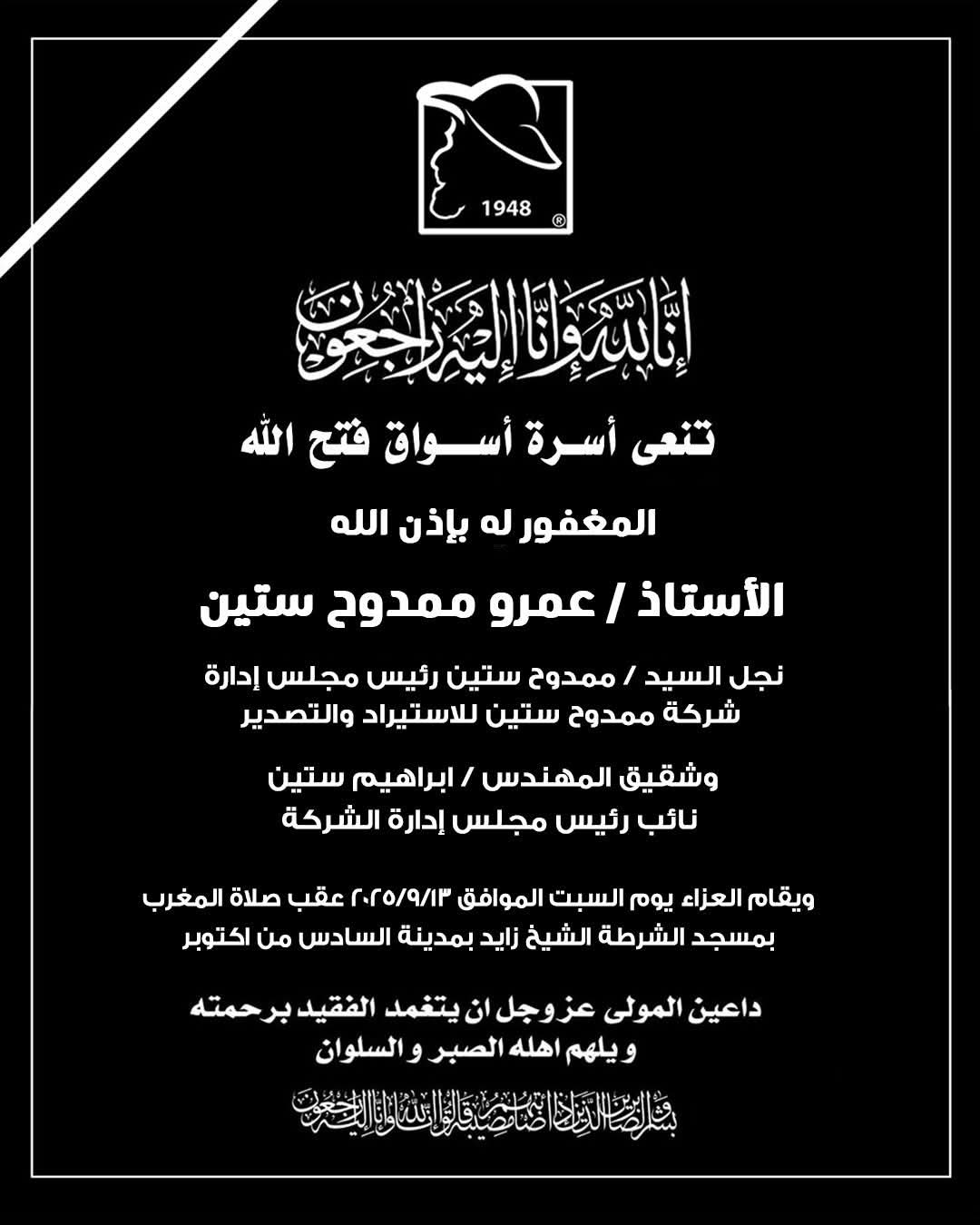 تنعى أسرة أسواق فتح اللّٰه المغفور له بإذن الله الفنان عمرو ممدوح ستين نجل رجل الأعمال ممدوح ستين رئيس مجلس إدارة شركة ممدوح ستين للاستيراد والتصدير وشقيق المهندس إبراهيم ستين نائب رئيس مجلس إدارة الشركة داعين المولى عز وجل ان يتغمد الفقيد برحمته ويلهم اهله الصبر والسلوان