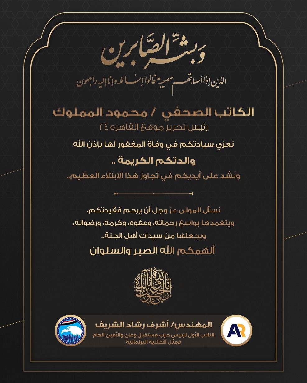 يتقدم المهندس أشرف رشاد الشريف الأمين العام والنائب الأول لرئيس حزب مستقبل وطن وممثل الأغلبية البرلمانية بمجلس النواب بخالص التعازي والمواساة في وفاة والدة الكاتب الصحفي محمود المملوك رئيس تحرير القاهرة24 داعيًا الله أن يعفو عنها ويهوِّن عليها لقاءه، وأن تكون الليلة أفضل لياليها