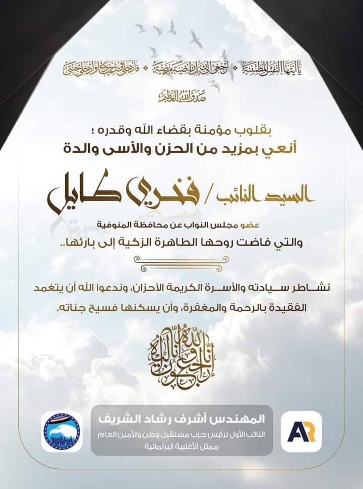 نعي النائب البرلماني المهندس أشرف رشاد الشريف- الأمين العام لحزب مستقبل وطن وممثل الأغلبية البرلمانية بمجلس النواب والدة النائب فخري طايل عضو مجلس النواب عن دائرة تلا بمحافظة المنوفية والذي رحلت عن عالمنا اليوم الاثنين وجاء في نص النعي بقلوب مؤمنة بقضاء الله وقدره ؛ أنعي بمزيد من الحزن والأسى والدة السيد النائب