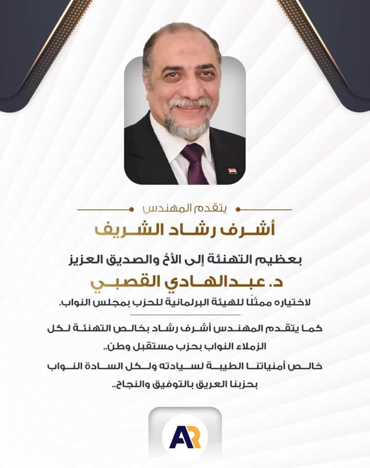 كما يتقدم المهندس أشرف رشاد بخالص التهنئة لكل الزملاء النواب بحزب مستقبل وطن