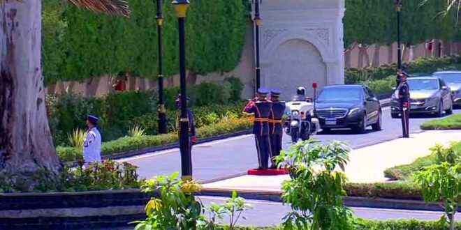 وتقام الان مراسم استقبال رسمية لضيف مصر لدى وصوله قصر الاتحادية؛ حيث يستعرض الرئيس السيسي، والأمير تميم حرس الشرف، ويتم عزف السلام الوطني لجمهورية مصر العربية، ولدولة قطر.