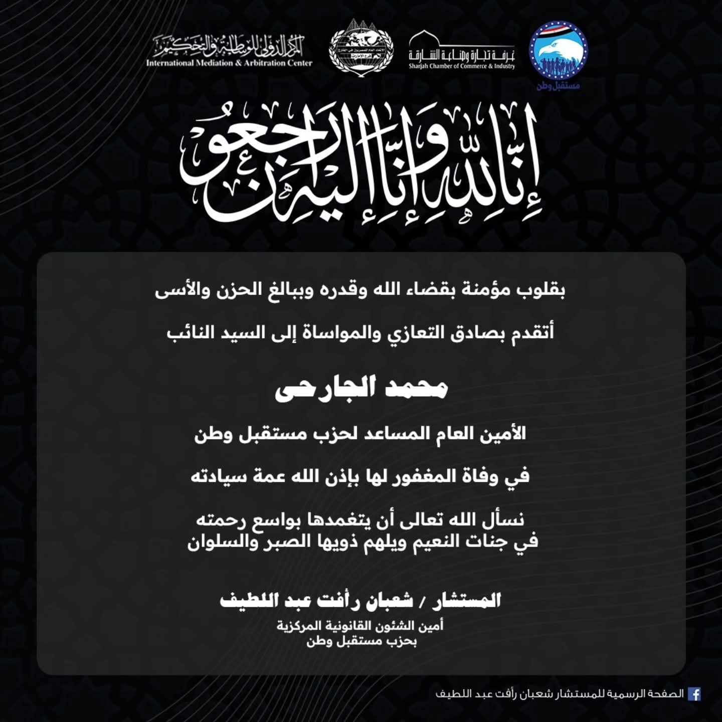 المستشار | شعبان رأفت عبد اللطيف ” ينعي وفاة عمة النائب محمد الجارحي ” الأمين العام المساعد بحزب مستقبل وطن