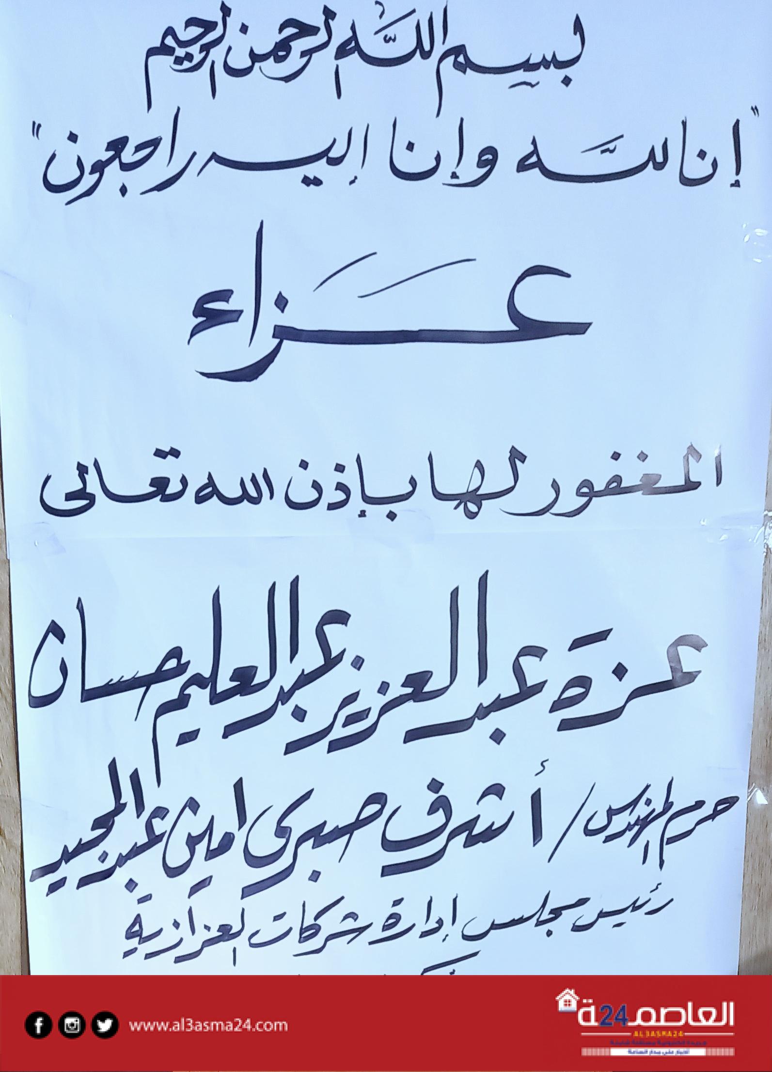 أقيم مساء اليوم الخميس سرداق عزاء السيدة عزة عبد العزيز حرم المهندس اشرف صبري رئيس مجلس إدارة شركة العزيزية بمسجد عمر مكرم بوسط القاهرة