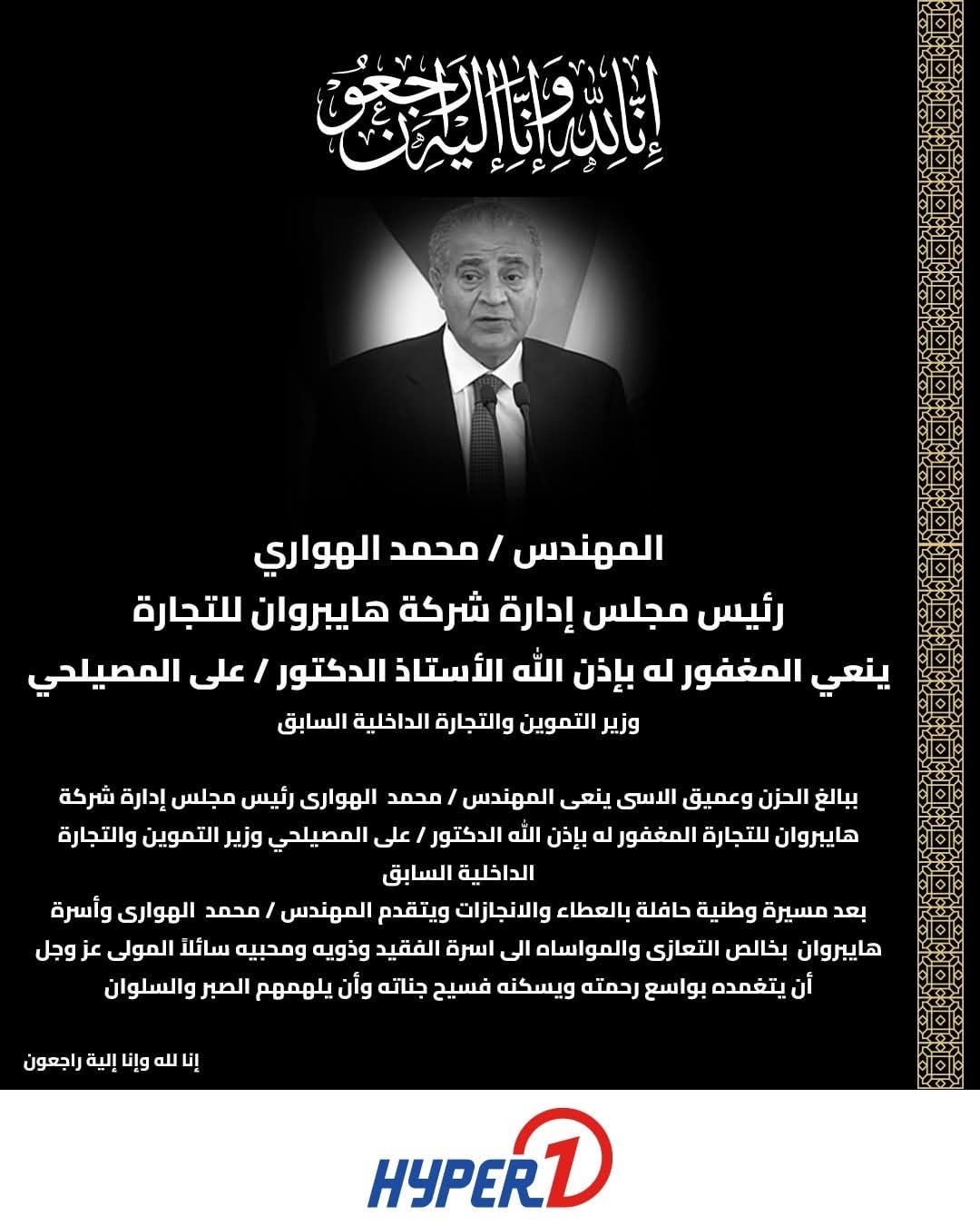 نعي المهندس | محمد الهواري رئيس مجلس إدارة مجموعة هايبر ماركت ” الدكتور الراحل علي المصيلحي وزير التموين والتجارة الداخلية السابق الذي وافته المنية أول من أمس عن عمر ناهز 76 عاما بعد صراع طويل مع مرض السرطان داعيًا المولي عز وجل أن يتغمده بواسع رحمته ويسكنه فسيح جناته ويلهم أسرته ومحبيه الصبر والسلوان