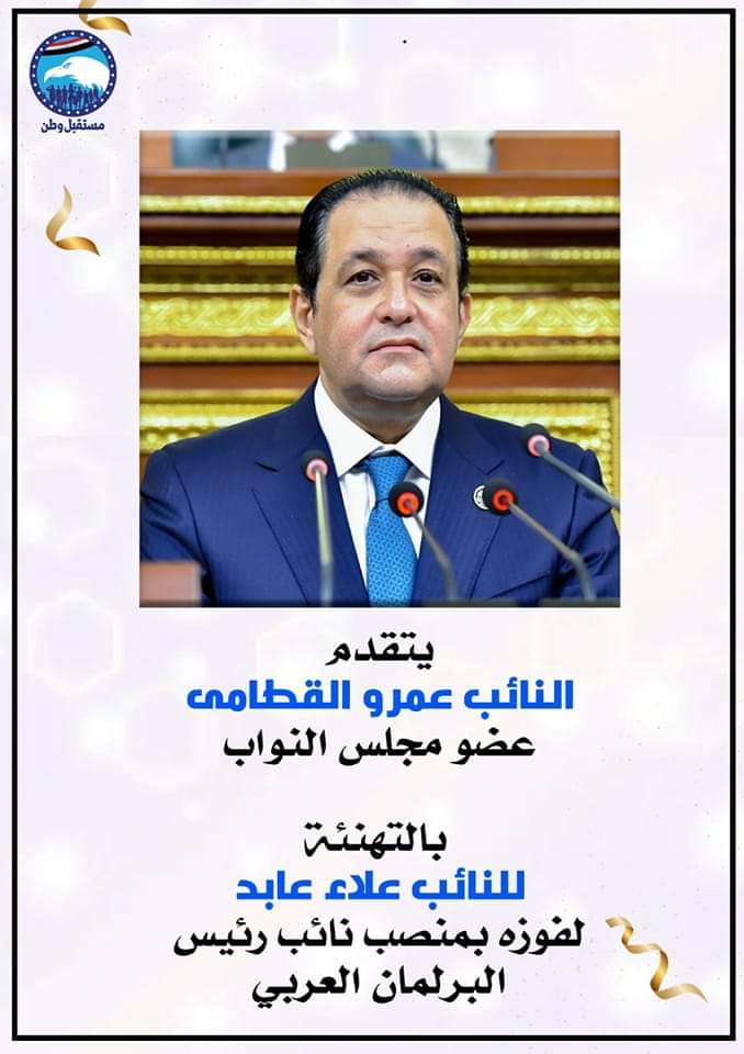هنأ النائب البرلماني عمرو القطامي عضو مجلس النواب النائب علاء عابد رئيس لجنة النقل والمواصلات بمجلس النواب، ونائب رئيس حزب مستقبل وطن، لفوزه بمنصب نائب رئيس البرلمان العربي، مؤكدا أنه تكليف بالغ الأهمية حيث ينتظركم الكثير من الأعباء والمسئوليات التي نحن على ثقة كبيرة من قدرتكم على القيام بها على أفضل نحو ممكن