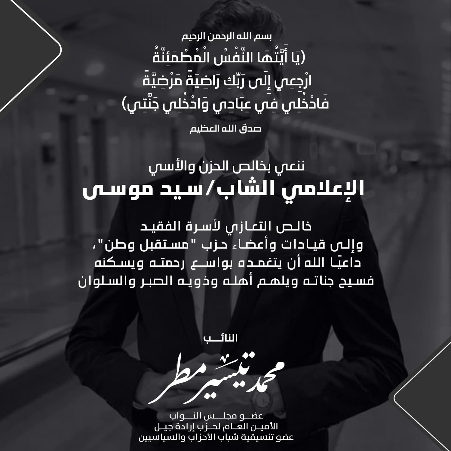 نعى النائب البرلماني محمد تيسير مطر، أمين سر لجنة حقوق الإنسان بمجلس النواب وعضو تنسيقية شباب الأحزاب والسياسين وأمين عام حزب إرادة جيل، وفاة الكاتب الصحفي سيد موسي عضو هيئة مكتب الأمين العام لحزب مستقبل وطن إثر حادث أليم.