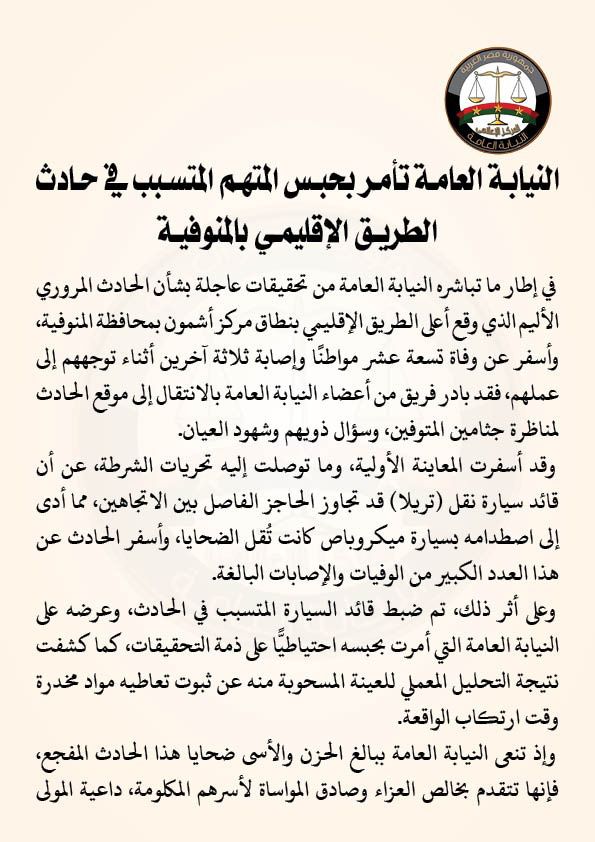 في إطار ما تباشره النيابة العامة من تحقيقات عاجلة بشأن الحادث المروري الأليم الذي وقع أعلى الطريق الإقليمي بنطاق مركز أشمون بمحافظة المنوفية، وأسفر عن وفاة تسعة عشر مواطنًا وإصابة ثلاثة آخرين أثناء توجههم إلى عملهم، فقد بادر فريق من أعضاء النيابة العامة بالانتقال إلى موقع الحادث لمناظرة جثامين المتوفين، وسؤال ذويهم وشهود العيان
