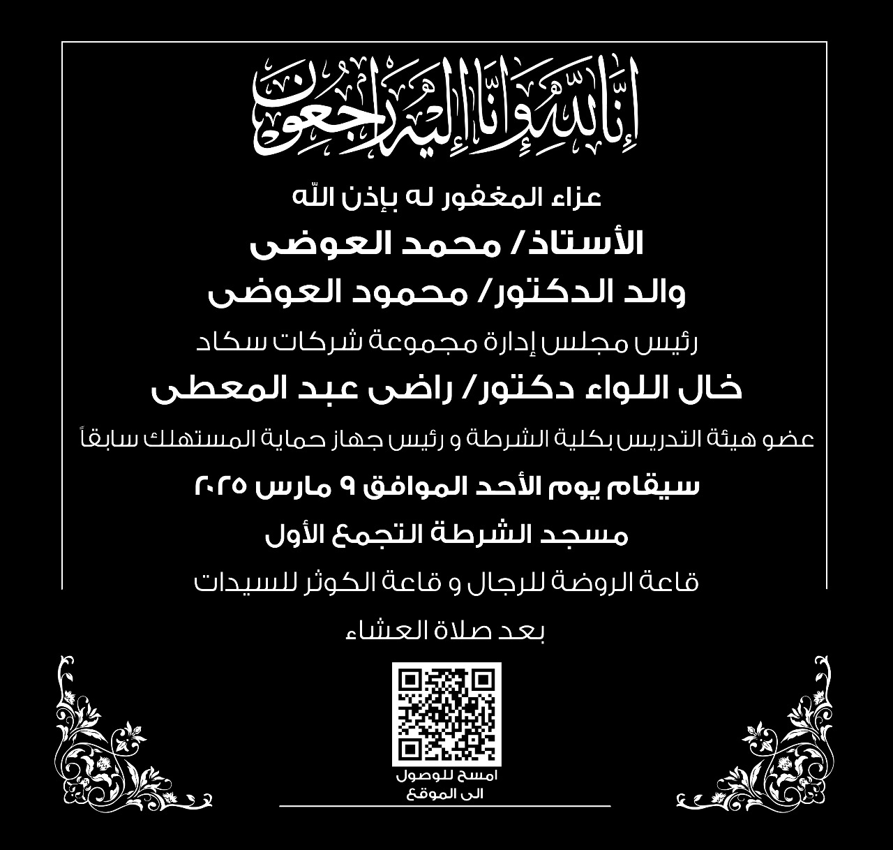 يقام مساء اليوم الاحد عزاء السيد | محمد العوضي والد الدكتور | محمود العوضي رئيس مجلس إدارة مجموعة شركات سكاد ” خال اللواء دكتور | راضي عبد المعطي مساعد أول وزير الداخلية – رئيس جهاز حماية المستهلك الأسبق وذلك بمسجد الشرطة بمنطقة التجمع الأول بالقاهرة الجديدة عقب صلاة العشاء والتراويح بقاعة الروضة الرئيسية