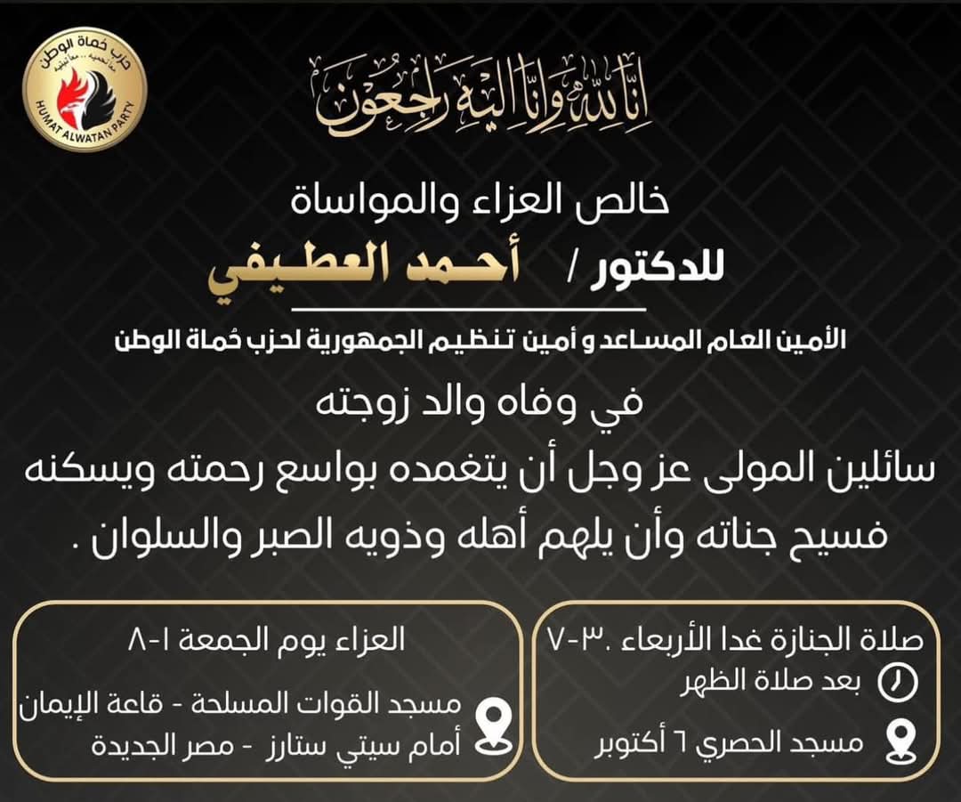 يقام مساء اليوم الجمعة عزاء والد زوجة الدكتور | أحمد العطيفي" أمين التنظيم بحزب حماة الوطن وذلك بمسجد القوات المسلحة المجاور لفندق ستي استارز بمدينة نصر - عقب صلاة المغرب