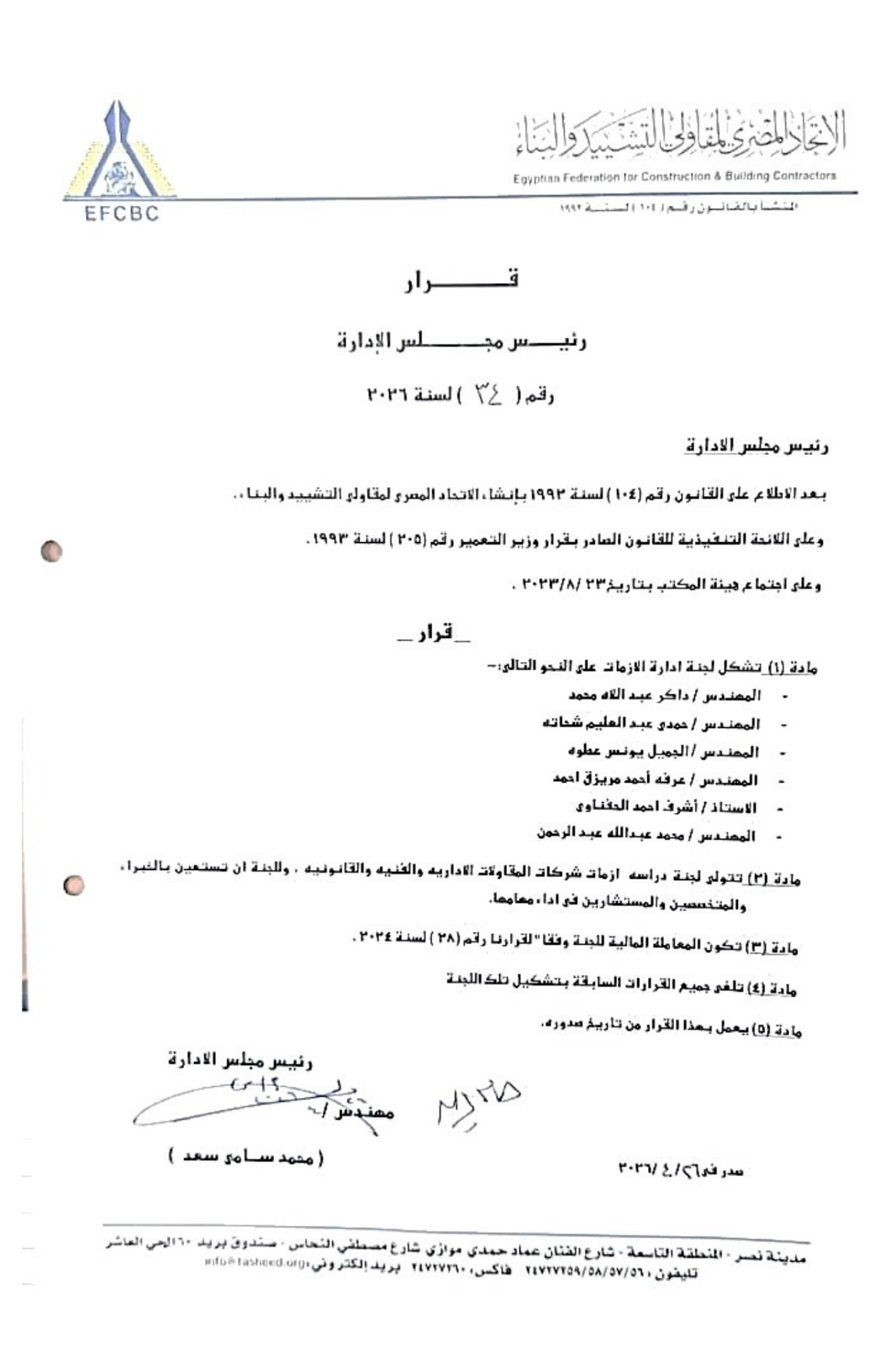 في خطوة تعكس الثقة في الكفاءات والخبرات الوطنية، أصدر المهندس محمد سامي سعد، رئيس الاتحاد المصري لمقاولي التشييد والبناء، قرارًا بتعيين المهندس داكر عبد اللاه رئيسًا للجنة إدارة الأزمات بالاتحاد.