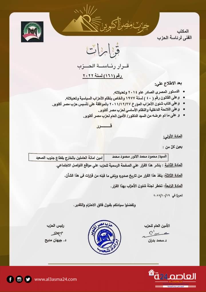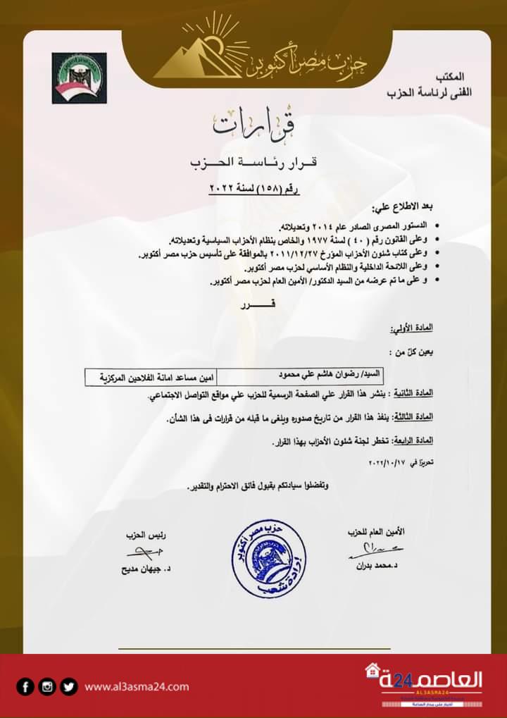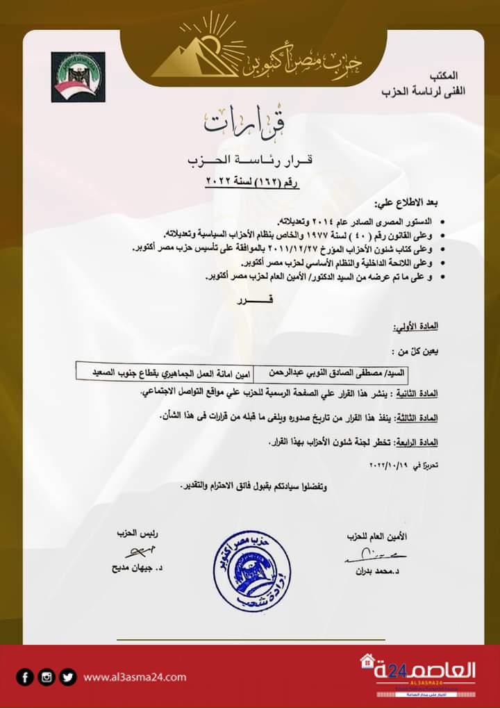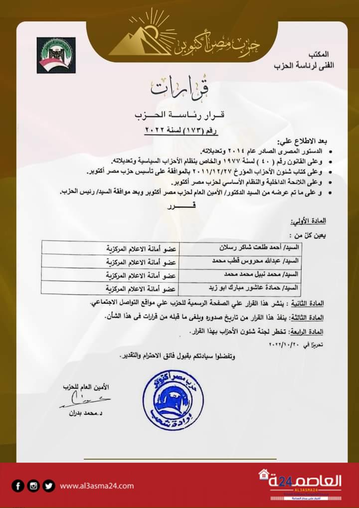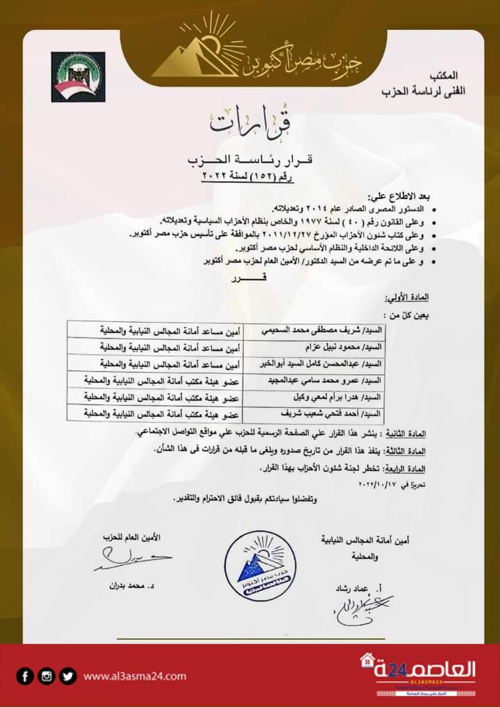 وتتضمن القرارات تعيين محمد حمدي رزق، نائبًا لرئيس الحزب، هشام محمد بدوي أمينًا لمحافظة الجيزة، شرف الدين محمد شرف الدين، أمينًا للحزب بمحافظة السويس، محمد عاطف الرفاعي نائباً لرئيس لجنة الصحة المركزية، علاء زكي إبراهيم أميناً للجنة العمال المركزية، مصطفى جاد، أميناً مساعداً لأمانة العمال المركزية، وأميرة عبدالكريم، أميناً مساعداً لأمانة المرأة المركزية