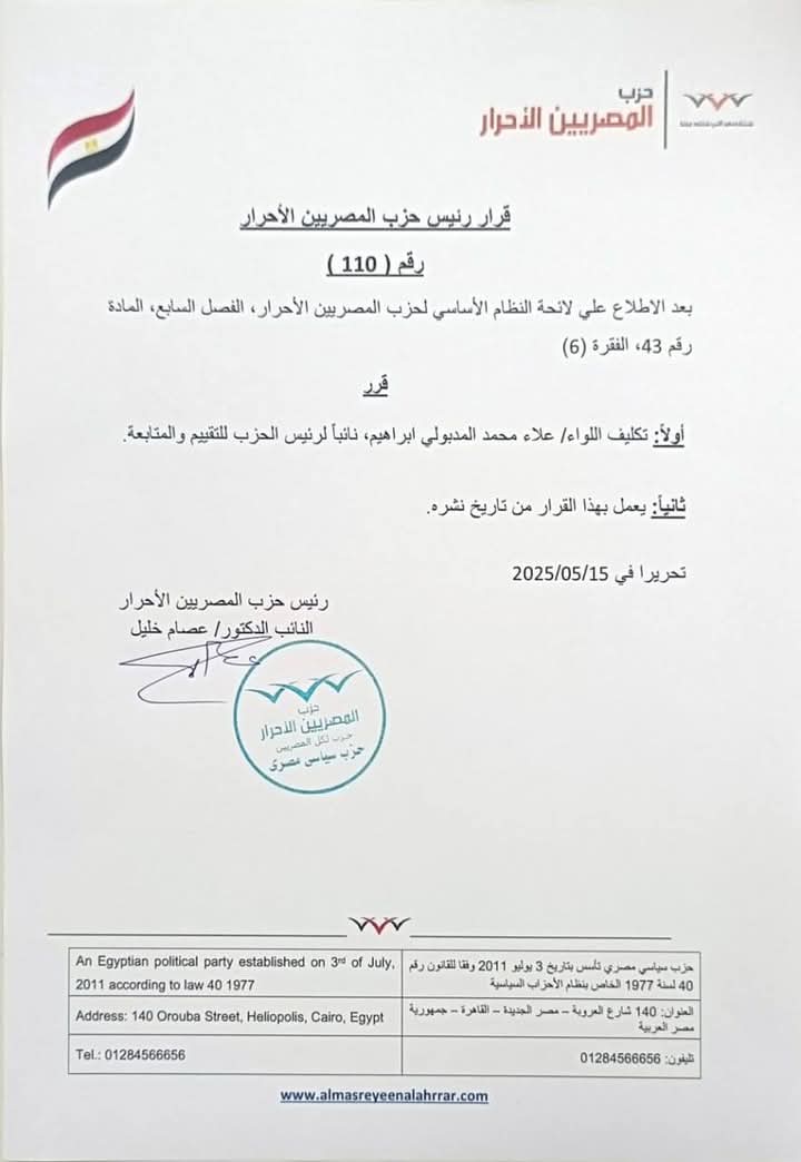 أصدر النائب الدكتور عصام خليل، رئيس حزب “المصريين الأحرار” وعضو مجلس الشيوخ، قرارًا بتكليف اللواء أ.ح/ علاء محمد المدبولي إبراهيم بمنصب نائب رئيس الحزب للتقييم والمتابعة، وذلك استنادًا إلى لائحة النظام الأساسي للحزب (الفصل السابع، المادة ٤٣ – الفقرة السادسة) ؛ويُعمل بالقرار من تاريخ نشره.