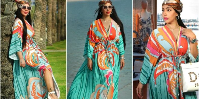 اعتمدت رشا السيد فستان واسع بألوان صيفية تحمل اللونين التركواز والبرتقالي وارتدت اكسسوارات ونظارة شمس أظهروا جمالها.