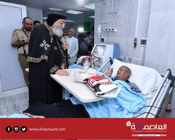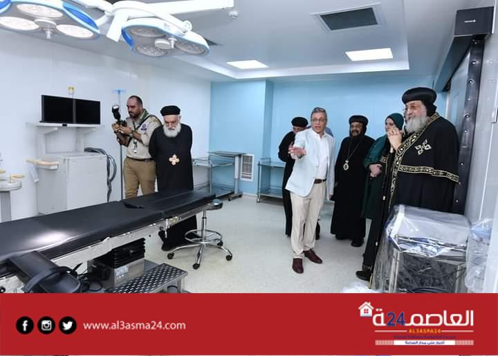تفقد بعدها قداسة البابا ترافقه الدكتورة غادة ندا وكيل وزارة الصحة بالإسكندرية، أقسام المستشفى: الداخلي بمختلف درجاته، وغرف العمليات، والعناية المركزة وعمليات القلب المفتوح والقسطرة، إلى جانب قسم الغسيل الكلوي