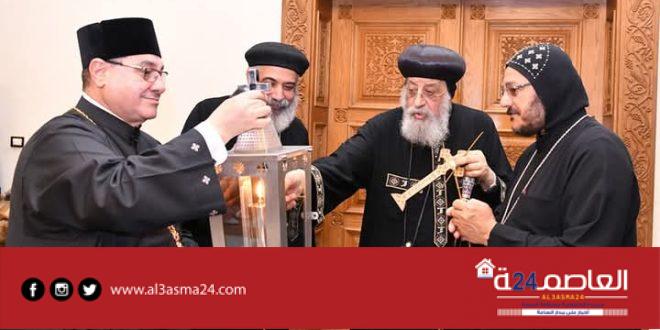 استقبل قداسة البابا تواضروس الثاني في المقر البابوي بالقاهرة اليوم الخميس، الآباء كهنة وخدام رابطة القدس بالقاهرة، حيث سلموا لقداسته النور المقدس المأخوذ من النور الذي يخرج من قبر السيد المسيح يوم سبت النور (السبت الماضي)، والذي أرسله نيافة الأنبا أنطونيوس مطران القدس والكرسي الأورشليمي والشرق الأدنى، لتتبارك به الكنائس القبطية في مصر