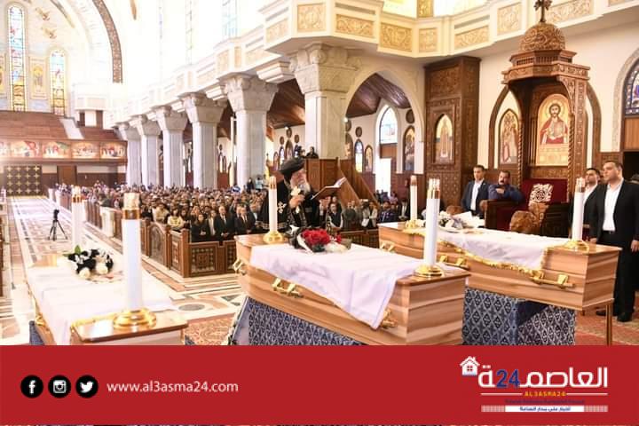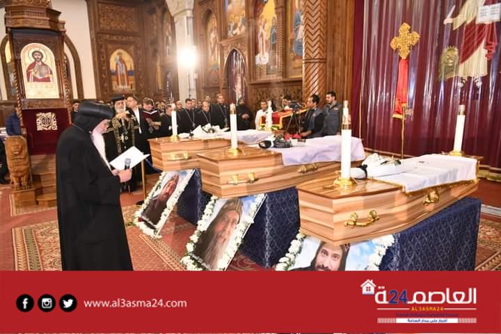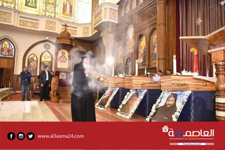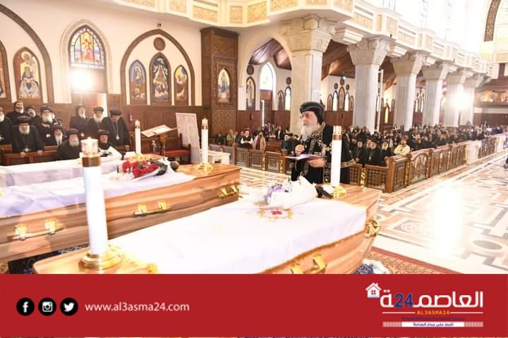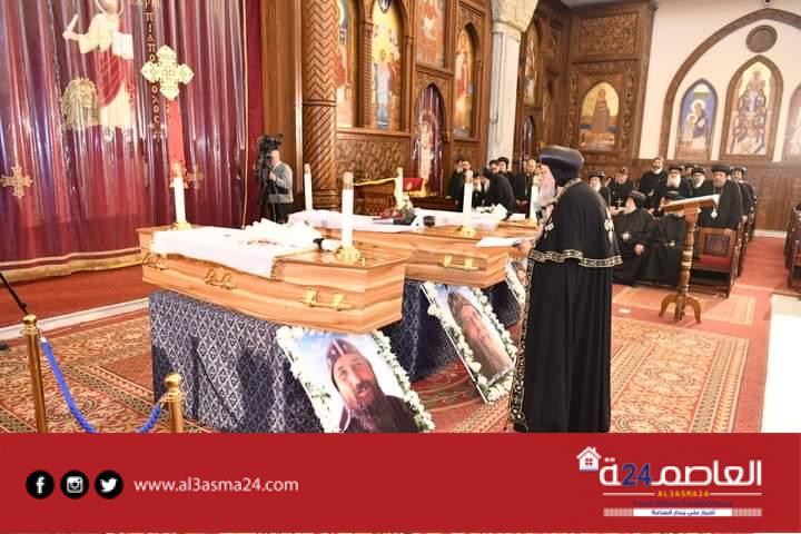 وكانت أعلنت الكنيسة في بيان لها اليوم أنه سيتم نقل الجثامين عقب انتهاء صلوات التجنيز، إلى دير القديس الأنبا صموئيل المعترف بجبل القلمون، لإتمام إجراءات دفن الرهبان الثلاثة به، وهم، الراهب القمص تكلا الصموئيلي وكيل إيبارشية جنوب إفريقيا، والراهب يسطس آڤا ماركوس، والراهب مينا آڤا ماركوس