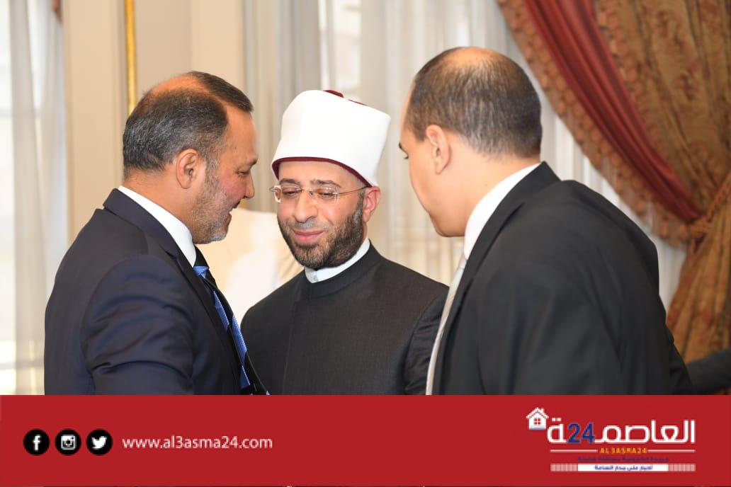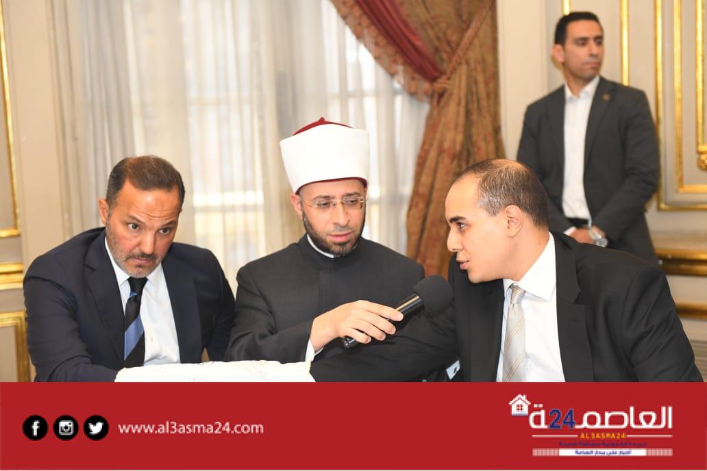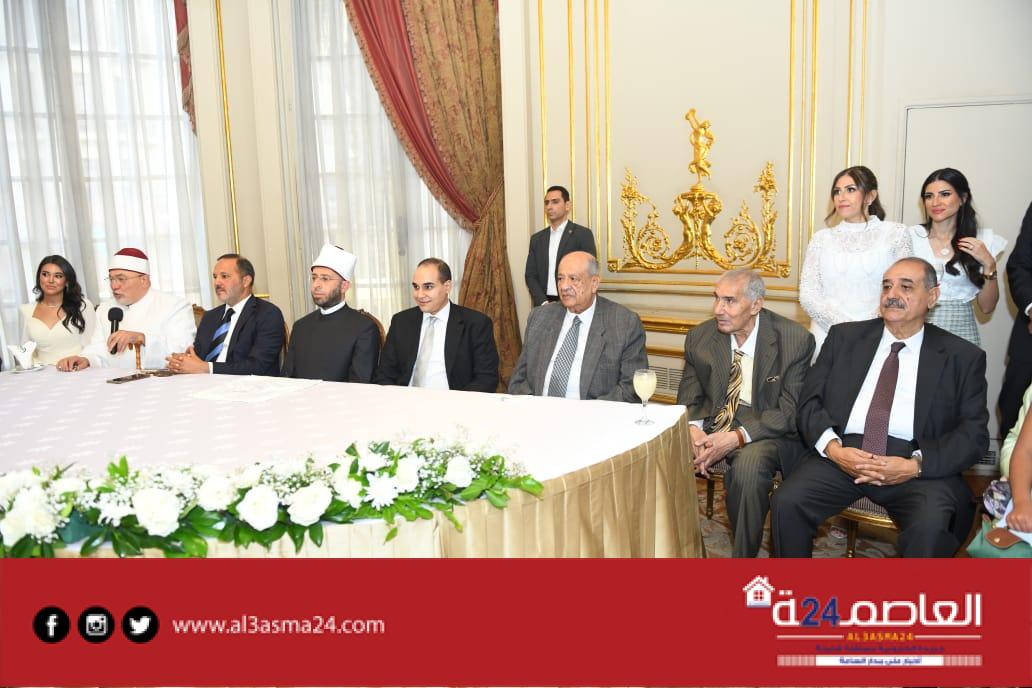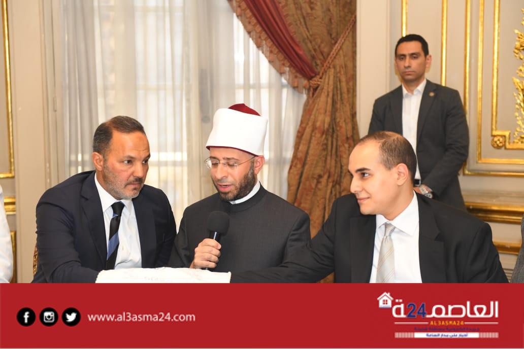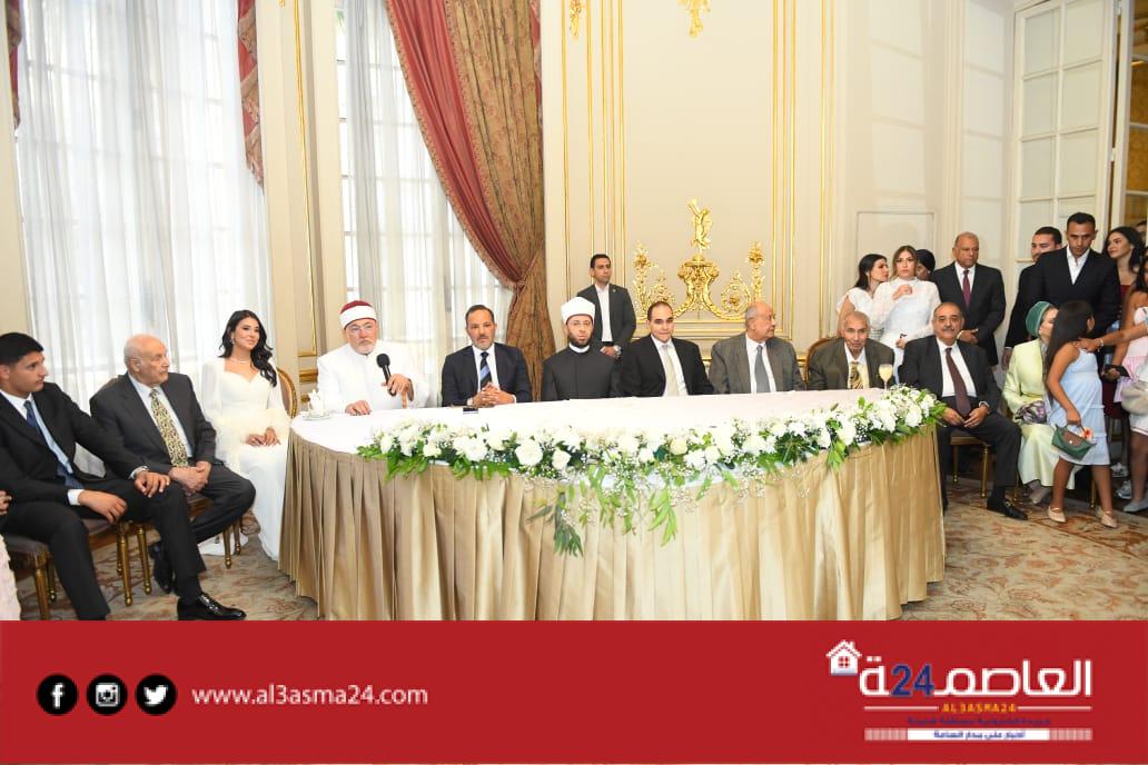 حيث شهد الدكتور | أسامة الأزهري وزير الأوقاف علي عقد القران وسط أجواء مليئة بالفرحة لدي الحاضرين وشهد علي عقد القران اللواء | جلال السادات عم العريس واللواء | محمد عبد الرحمن جد العروسة والدكتور معتز غانم وحرمه