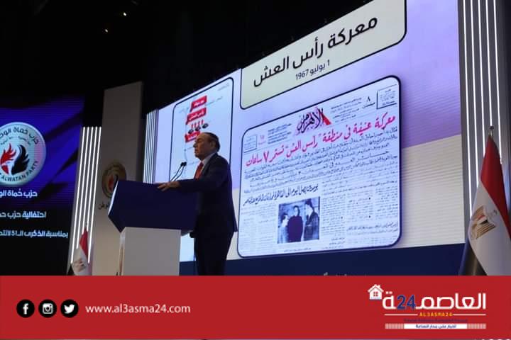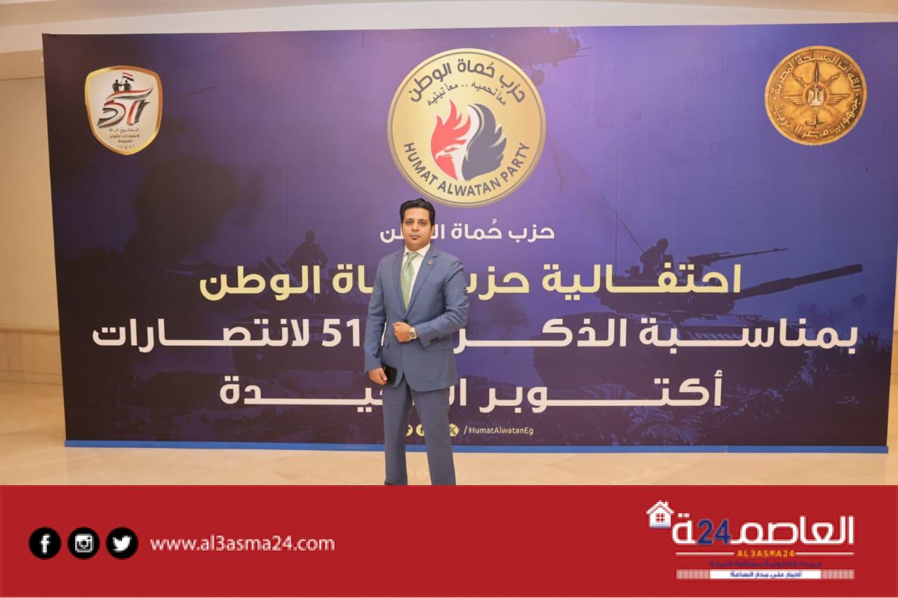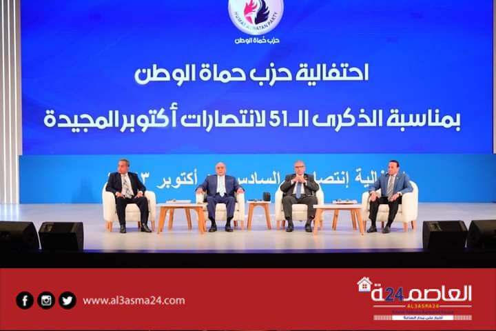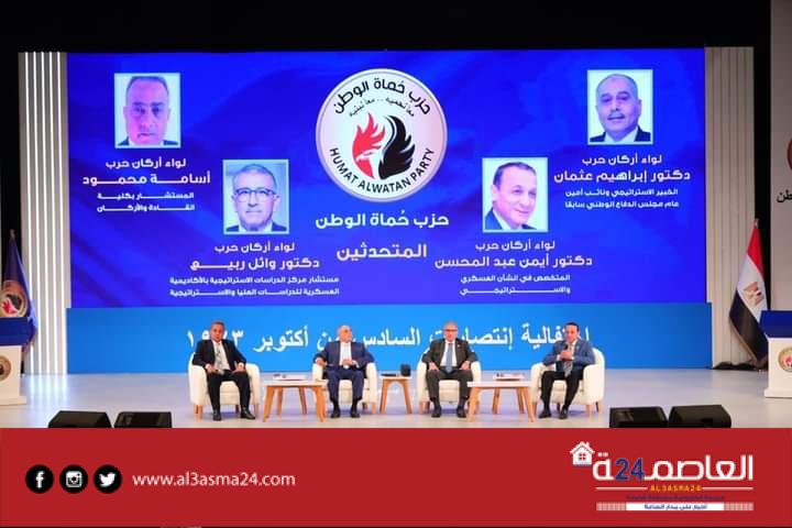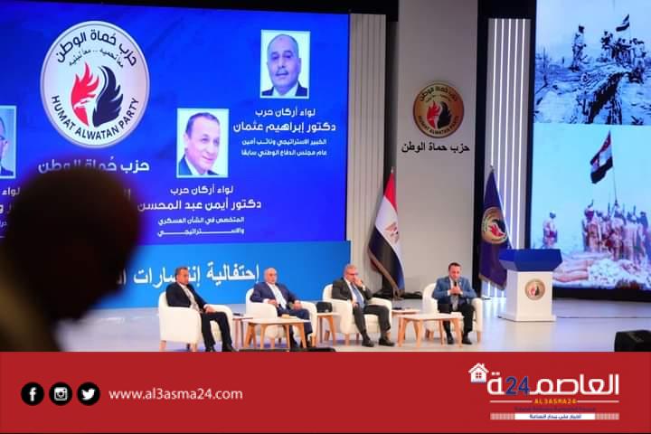 نظم حزب حماة الوطن مساء اليوم السبت احتفالية بمناسبة الذكرى ال 51 لانتصارات أكتوبر المجيدة، بمركز المنارة للمؤتمرات الدولية بالقاهرة الجديدة بحضور الفريق جلال الهريدي رئيس الحزب واللواء أحمد العوضي والنائب الأول لرئيس الحزب واللواء طارق نصير، الأمين العام والدكتور أحمد العطيفي، أمين التنظيم، الأمين العام المساعد، والنائب أحمد بهاء شلبي، رئيس الهيئة البرلمانية للحزب بمجلس النواب وأمل رضا عضو الامانة العامة للتواصل مع المستثمرين بحزب حماة الوطن والمهندسة رباب عبد العاطي والدكتور محمد الزهار، أمين لجنة العلاقات الخارجية بحزب حماة الوطن واللواء أيمن عبد المحسن، رئيس الهيئة البرلمانية للحزب بمجلس الشيوخ والدكتور محمد أسعد، مساعد رئيس الحزب، أمين الصندوق ووهاني العتال، مساعد رئيس الحزب، أمين أمانة الإعلام المركزية والمهندس كريم أمام ” أمين أمانة الشباب المركزية بحزب حماة الوطن والنائب عيسى أبو تمر عضو مجلس النواب أمين حزب حماة الوطن بمطروح عضو لجنة الدفاع والأمن القومي بمجلس النواب ومحمد أحمد ” أمين عضو الأمانة العامة الدائرة المركزية بحزب حماة الوطن