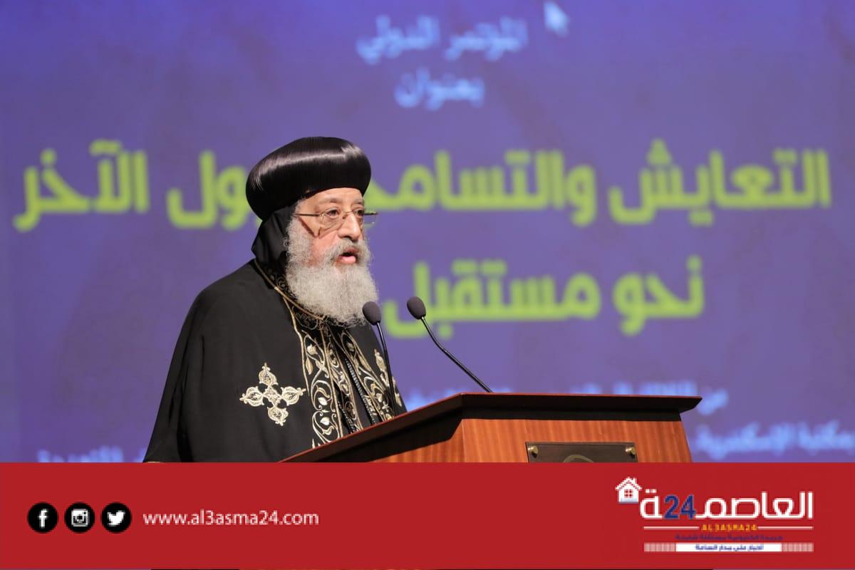 وفي كلمته، تحدث قداسة البابا الأنبا تواضروس الثاني؛ بابا الإسكندرية وبطريرك الكرازة المرقسية، عن ثلاثة عناوين؛ هي: التعايش حياة، التسامح أسلوب حياة، وقبول الآخر هو جودة الحياة