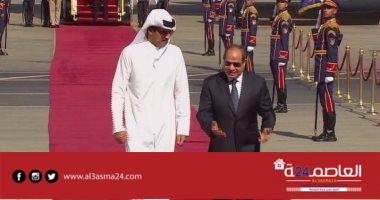 استقبل الرئيس عبد الفتاح السيسى رئيس الجمهورية " اليوم الجمهورية الأمير تميم بن حمد أمير قطر، لدى وصوله مطار القاهرة