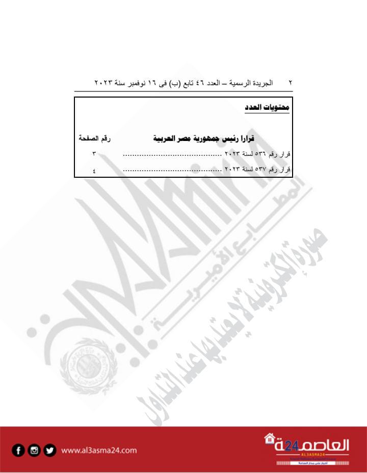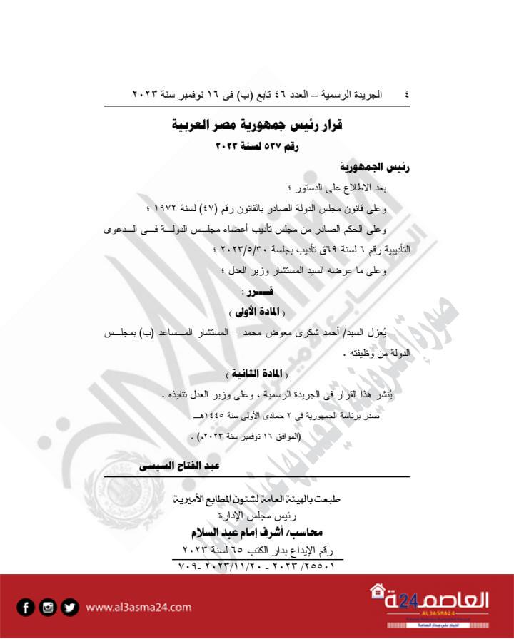 كما نشرت الجريدة الرسمية قرارًا للرئيس عبد الفتاح السيسى يحمل رقم 537 لسنة 2023 بعزل أحمد شكرى معوض محمد، المستشار المساعد (ب) بمجلس الدولة من وظيفته؛ بناء على الحكم الصادر من مجلس الدولة فى الدعوى التأديبية رقم 6 لسنة 69 ق تأديب بجلسة 30-5-2023، وعلى ما عرضه وزير العدل