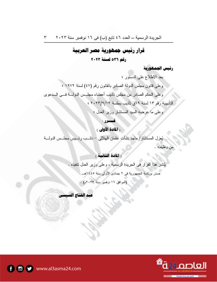 نشرت الجريدة الرسمية قرارًا للرئيس عبد الفتاح السيسى، يحمل رقم 536 لسنة 2023 بعزل المستشار ماجد نشأت عثمان الهلالى، نائب رئيس مجلس الدولة من وظيفته.