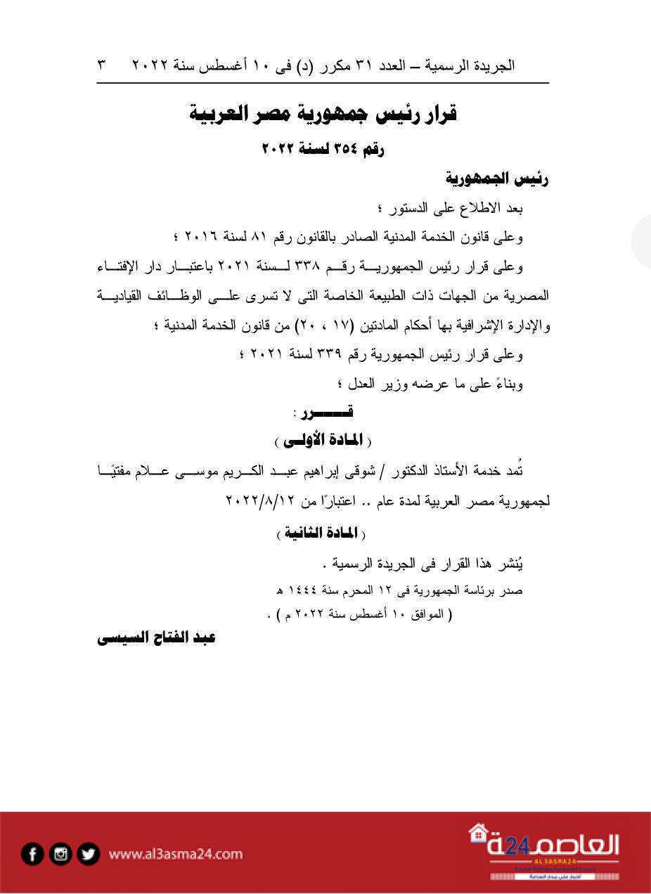 أصدر الرئيس عبدالفتاح السيسى، رئيس الجمهورية ، قرارا بمد خدمة الدكتور شوقى علام، مفتى الجمهورية، لمدة عام، ونشر ذلك بالجريدة الرسمية
