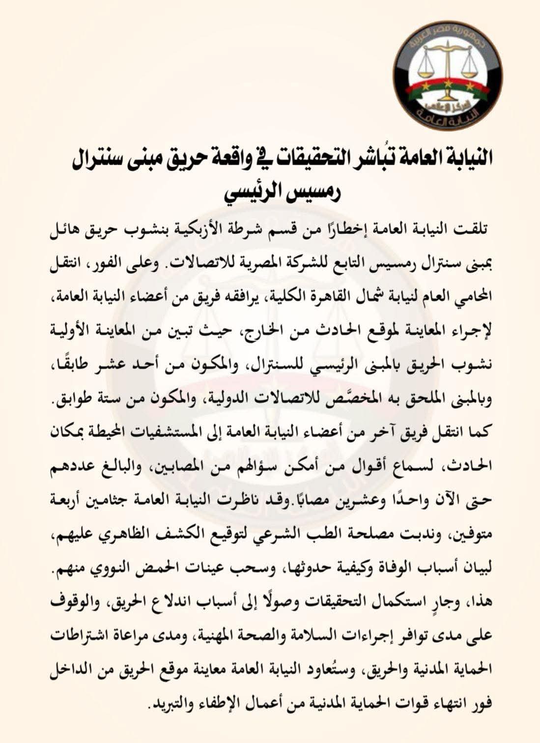 وتلقت النيابة العامة إخطارًا من قسم شرطة الأزبكية بنشوب حريق هائل بمبنى سنترال رمسيس التابع للشركة المصرية للاتصالات.