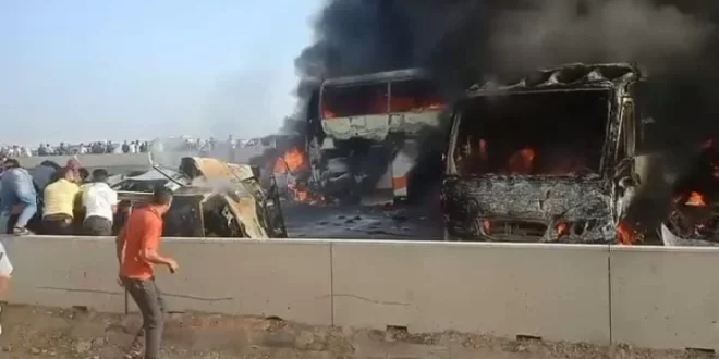 لقى 32 شخصا مصرعهم، وأصيب نحو 50 آخرون، في حادث تصادم بين عدد كبير من السيارات، على الطريق الصحراوي بالقرب من محافظة البحيرة
