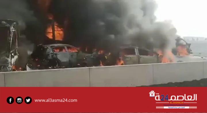 وتلقى اللواء محمود هويدي، مدير أمن البحيرة، إخطارا بالحادث، وكشفت التحريات، أنه أثناء سير سيارة على الطريق الصحراوي، على بعد نحو 132 كيلومترا شمالي العاصمة القاهرة، حدث تسرب للزيت، أدى بعدها إلى تصادم عدد كبير من السيارات، واشتعال النيران بعدد منها