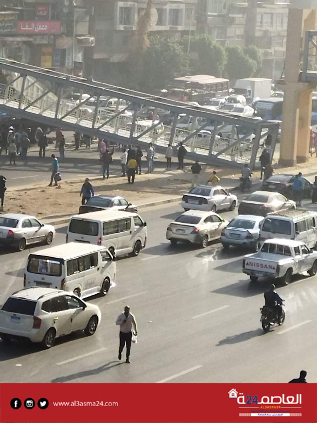 وظهرت كثافات مرورية مرتفعة بشارع أحمد عرابي في المهندسين، فور تلقي البلاغ بسقوط كوبرى مشاة أعلى الطريق بشارع أحمد عرابي وسط تواجد امني كثيف من رجال المرور والاجهزة الامنية بالجيزة.