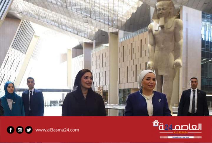 زارت السيدة انتصار السيسي، قرينة رئيس الجمهوريةوالسيدة عهد بنت عبدالله البوسعيدية قرينة السلطان هيثم بن طارق آل سعيد، سلطان عمان الشقيقة المتحف المصري الكبير بسفح الأهرامات بمنطقة الهرم اليوم الجمعة