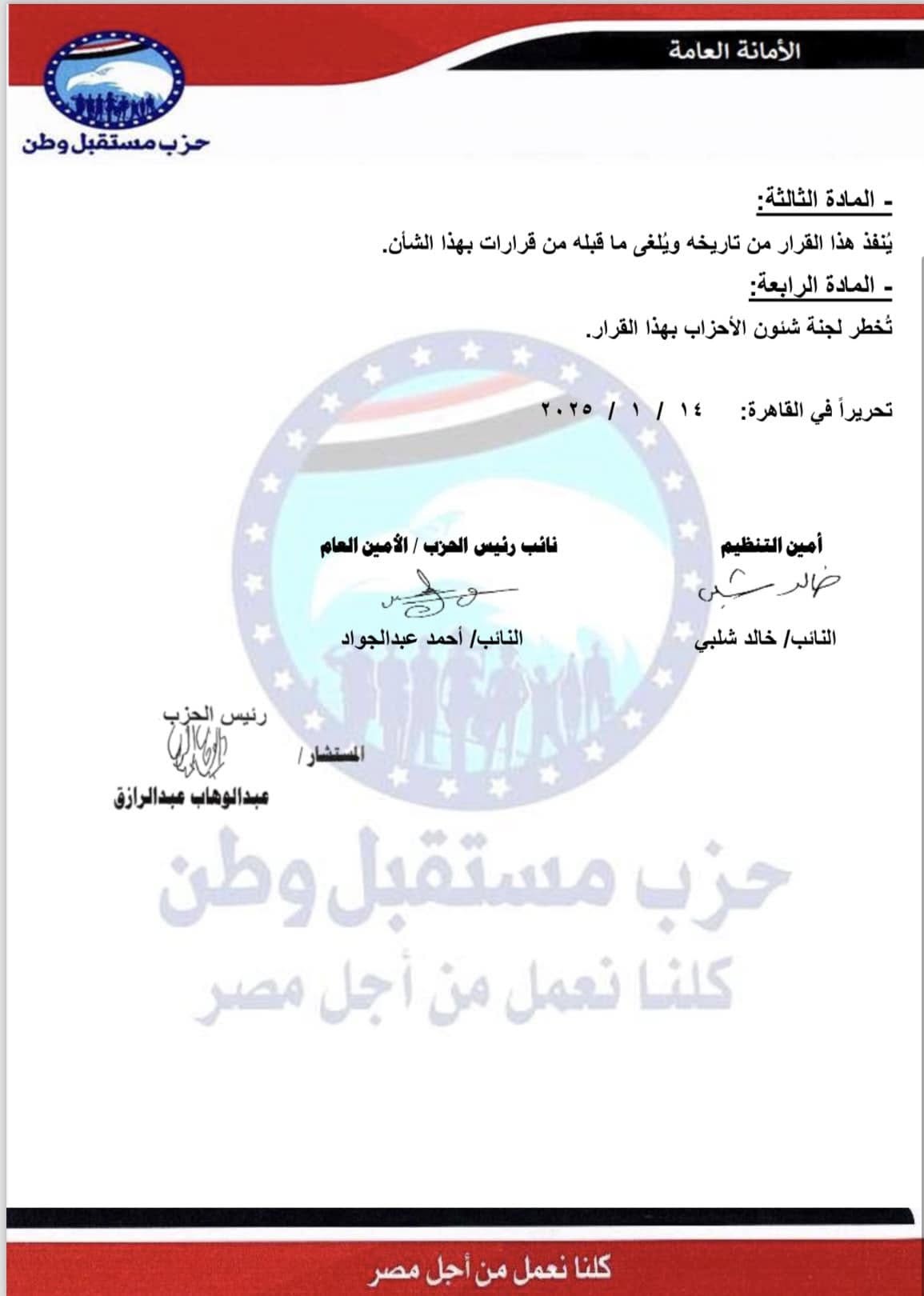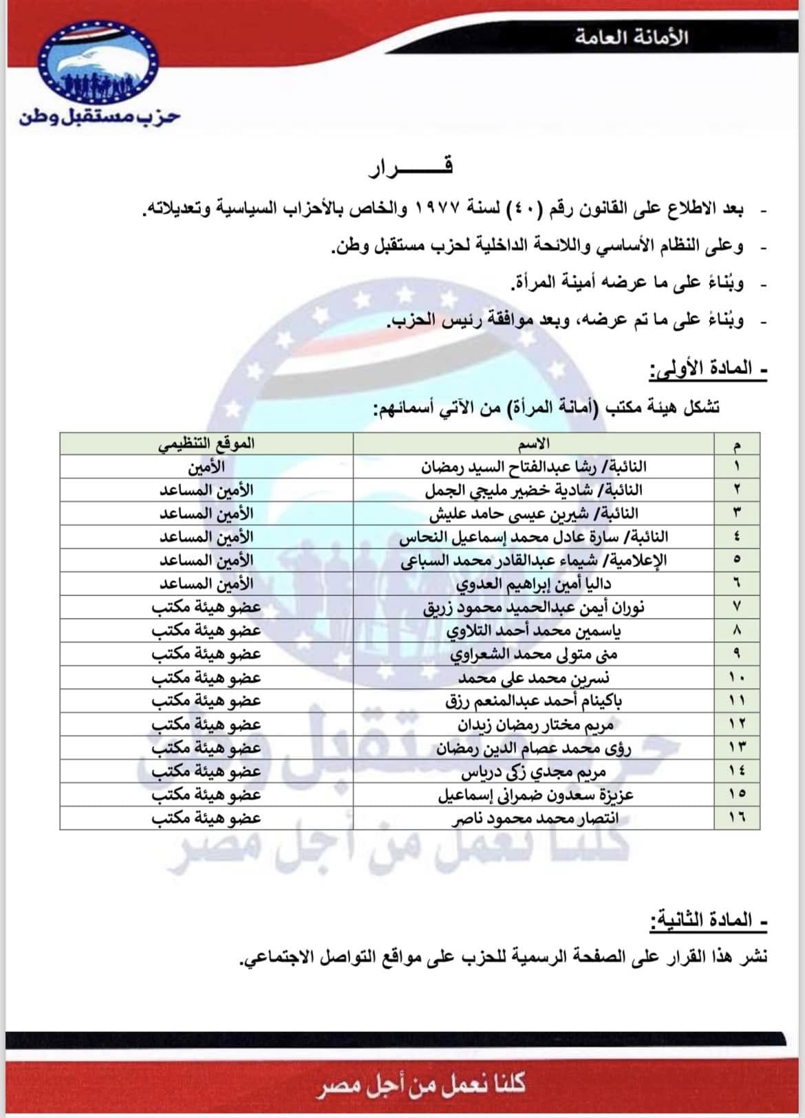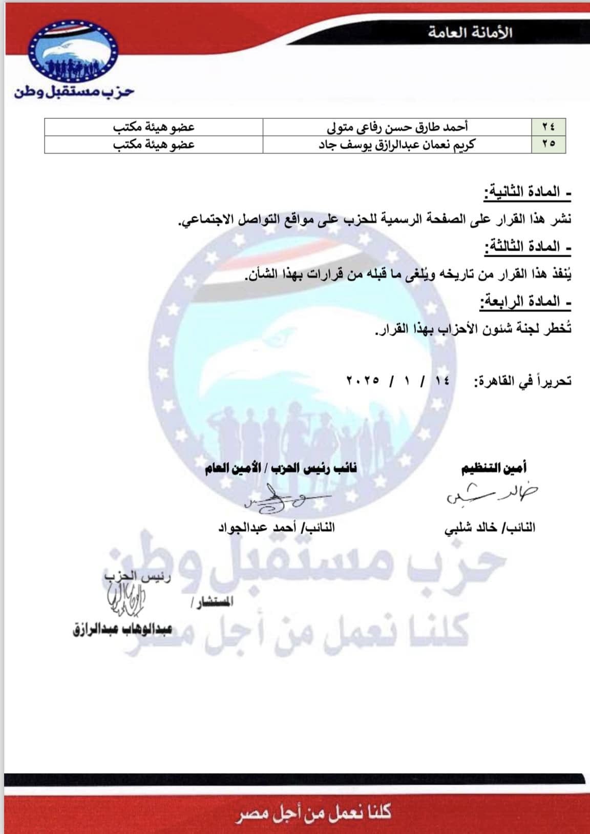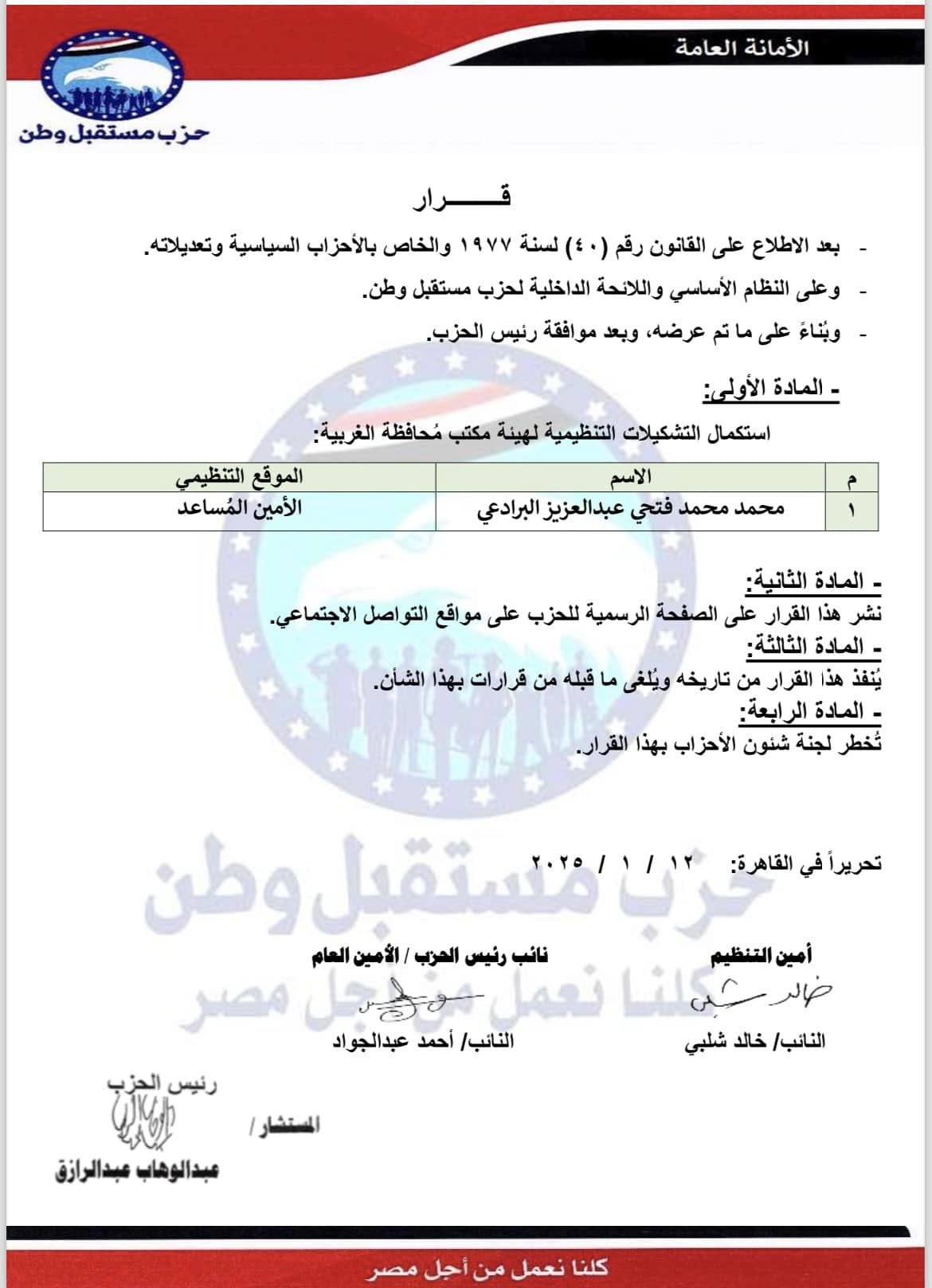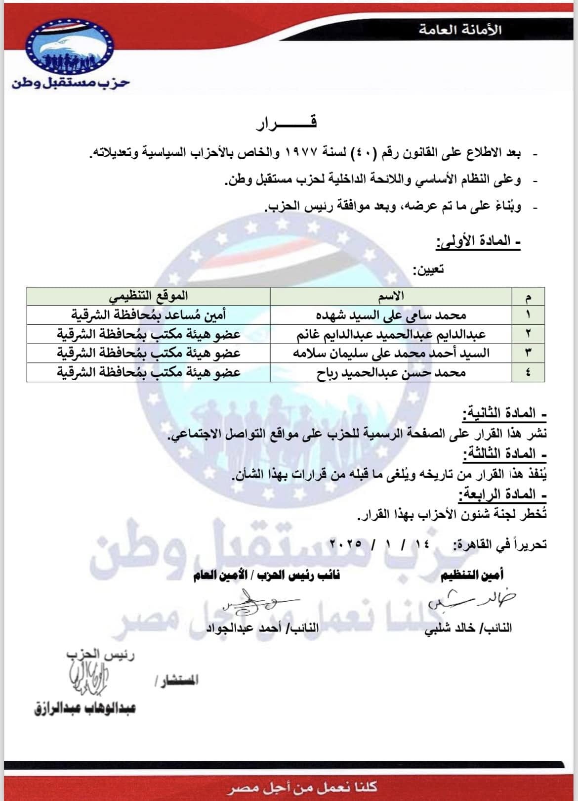 أصدر حزب مستقبل وطن قبل قليل اليوم الثلاثاء قرارات تنظيمية أعلن عنها الأمين العام – النائب | أحمد عبد الجواد الناب الأول لرئيس الحزب بشأن تشكيل بعض بعض الأمانات النوعية وأمانات المحافظات.