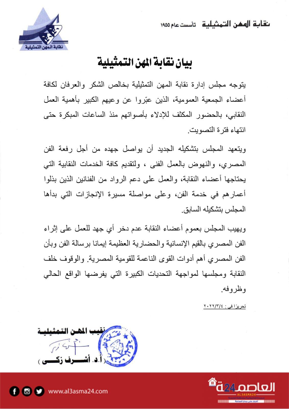 أصدرت منذ قليل نقابة المهن التمثيلية برئاسة الفنان الكبير الدكتور أشرف زكي بعد فوزه بمقعد نقيب الممثلين للدورة الثالثة علي التوالي والذي أقيمت صباح أمس الجمعة داخل نادي النقابة بشارع البحر الأعظم بالجيزة : وجاء علي النحو التالي بالبيان.