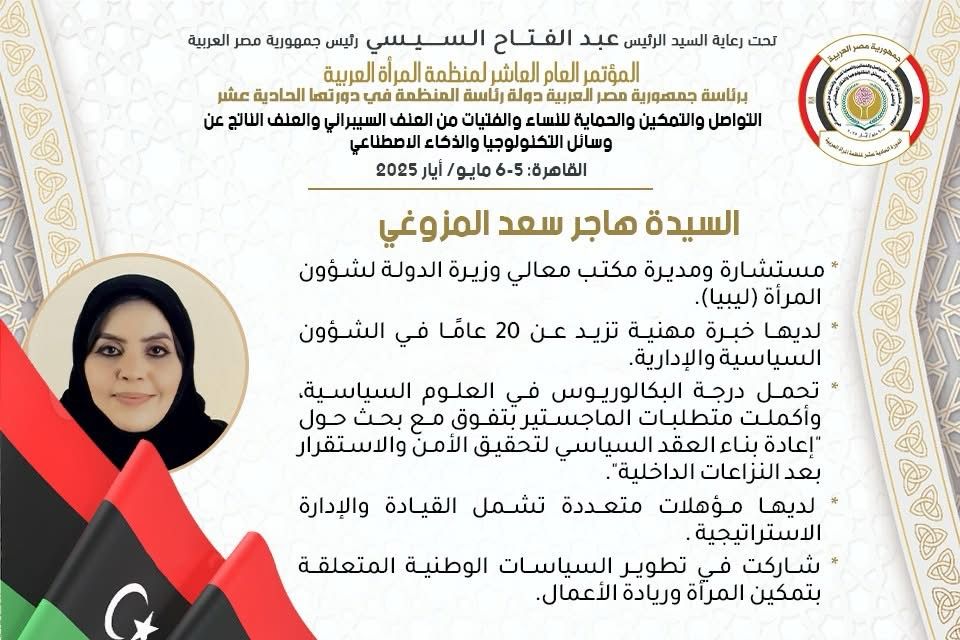 شاركت السيدة هاجر المزوغي مستشارة ومديرة مكتب وزيرة الدولة لشؤون المرأة في دولة ليبيا، في أعمال المؤتمر العام العاشر لمنظمة المرأة العربية بعنوان التواصل والتمكين والحماية للنساء والفتيات من العنف السيبراني والعنف الناتج عن وسائل التكنولوجيا والذكاء الاصطناعي”. ، المنعقد في جمهورية مصر العربية تحت الرعاية الكريمة من فخامة الرئيس عبد الفتاح السيسي.