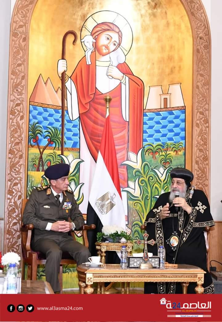 يرافقه الفريق أسامة عسكر رئيس أركان حرب القوات المسلحة وقادة الأفرع الرئيسية وعدد من قادة القوات المسلحة، حيث قدموا التهنئة لقداسته بمناسبة عيد الميلاد المجيد