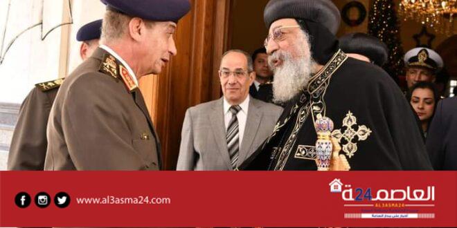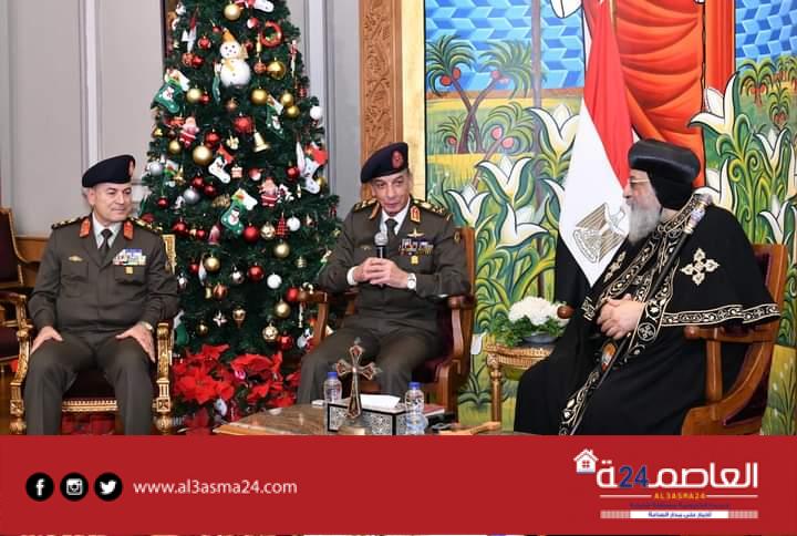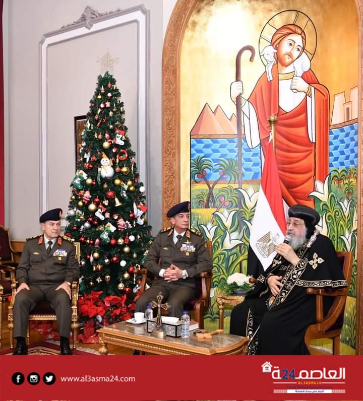 يرافقه الفريق أسامة عسكر رئيس أركان حرب القوات المسلحة وقادة الأفرع الرئيسية وعدد من قادة القوات المسلحة، حيث قدموا التهنئة لقداسته بمناسبة عيد الميلاد المجيد