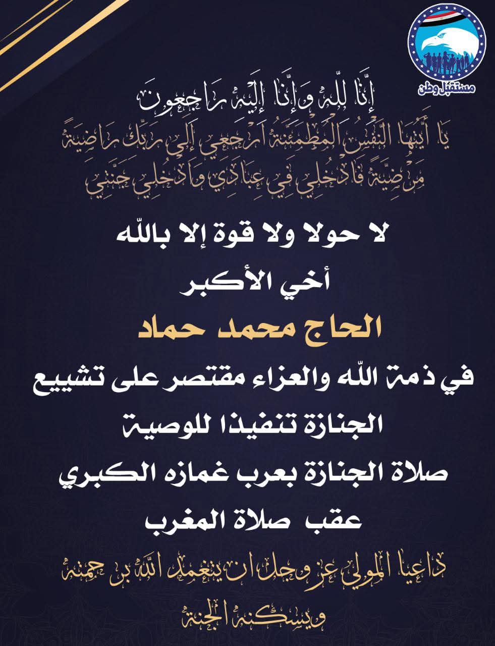 أعلن النائب | عيد حماد ” الأمين المساعد بحزب مستقبل وطن وعضو مجلس النواب عن دائرة حلوان عن وفاة شقيقه الحاج محمد حماد