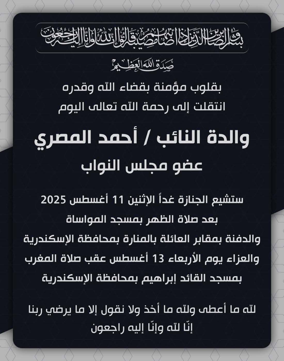 رحلت عن عالمنا اليوم الأحد والدة النائب البرلماني أحمد المصري " عضو مجلس النواب " عضو حزب مستقبل وطن بمحافظة الإسكندرية ومن المقرر تشييع جثمان الفقيدة ظهر اليوم الإثنين بمسجد المواساة بمنطقة باب شرق بالإسكندرية