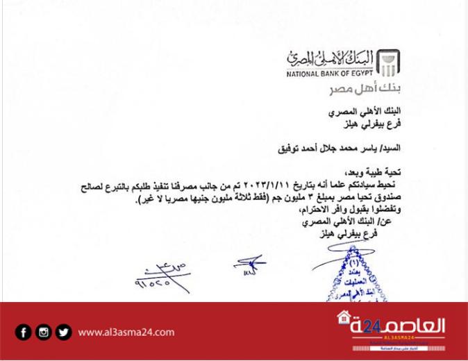 وأضاف ياسر جلال قائلا: “المرة ديه بعلن عن الجهة والمبلغ اللي اتبرعت بيه لأني بتمني إن كلنا نشترك ونعمل اللي نقدر عليه وبدعي زملائي النجوم إنهم يتبرعوا باللي يقدروا عليه انا عارف ان في منهم عمل الموضوع قبل كده بس لو عملوا ده تاني يبقي شيء عظيم”.