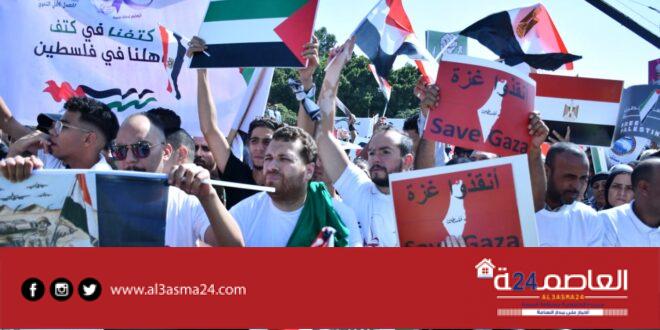ورفع المتظاهرون صورا للرئيس السيسي وأعلام مصر وفلسطين تأكيدا على حق الشعب الفلسطيني وعدالة قضيته، مرددين شعارات تأييد وتأكيد المضي قدما خلف القيادة السياسية وتفويضا لها في كل ما تراه في صالح القضية الفلسطينية وحماية الأمن القومي المصري